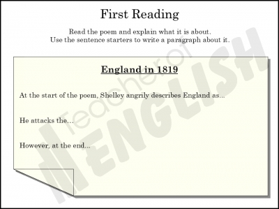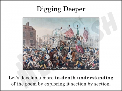The PowerPoint presentation introduces pupils to Shelley’s radical political beliefs and the historical background of 1819 — including the Peterloo Massacre and Britain’s social unrest. Through close analysis, students examine how Shelley uses the sonnet form to condemn England’s corrupt institutions and express his revolutionary hope for renewal.