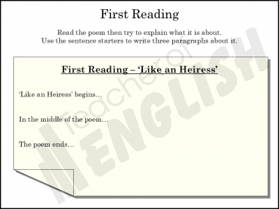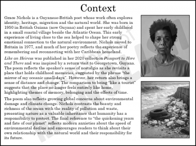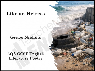 This comprehensive GCSE English Literature teaching resource for Like an Heiress by Grace Nichols is designed to support students studying the AQA Worlds and Lives poetry anthology. The fully resourced lessons develop students’ understanding of context, language, structure and themes while building the analytical and comparative skills required for success in the GCSE exam.